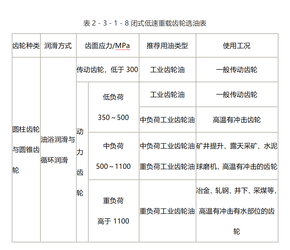 一般来说,正齿轮、斜齿轮、锥形齿轮及低速轻负荷螺旋齿轮可选用CKB抗氧防锈型工业齿轮油。齿面应力在350~1100 Mpa 并带有冲击负荷的齿轮CKC中负荷工业齿轮油。齿面应力大于1100 MPa 的齿轮应选用CKD重负荷工业齿轮油,见表2-3-8。