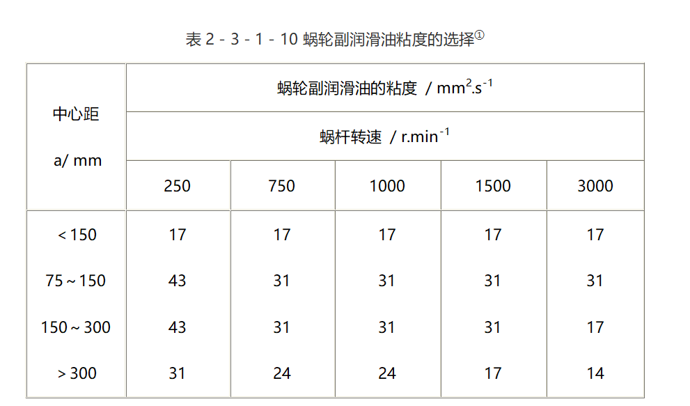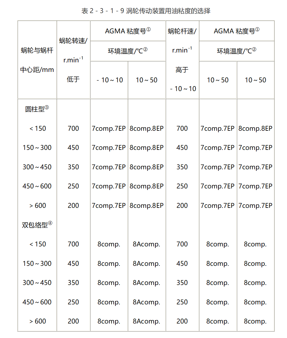 1、表中的粘度是100℃条件下运动粘度的中心值,当蜗杆的节圆速度超过10m.s-1时应采用循环压力喷油法,并且要喷到全齿宽上。