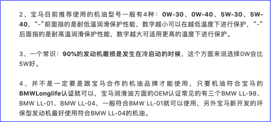 宝马推荐使用的机油型号有4种:0W-30、0W-40、5W-30、5W-40,“-”前面指的是耐低温润滑保护性能,数字越小可以在越低温度下进行保护,“-”后面指的是耐高温润滑保护性能,数字越大可适用更高的温度下进行保护。90%的发动机磨损是发生在冷启动的时候,这个方面来说选择0W会比5W好。